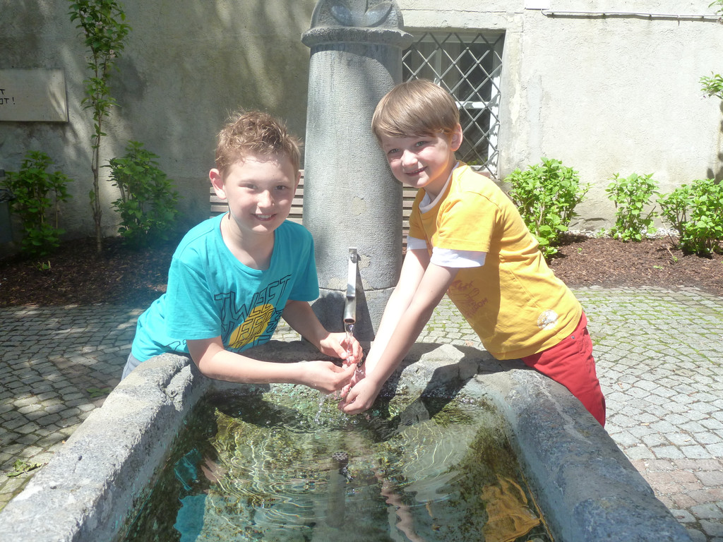 Eine kleine Abkühlung beim Brunnen im Gymnasiumsplatz gönnten sich Raphael und Oliver.