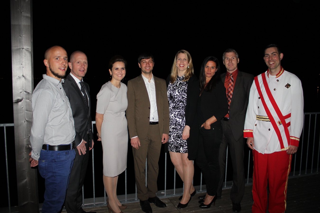 Die Organisatoren: Gerald Graninger (Prinz Fein-Brennerei), Horst Fallosch und Sandra Neukart (RIMC Austria), Renato Walter (Autohaus Toyota Walter), Annette Mätzler (Seehotel Am Kaiserstrand), Robert Zimmermann und Barbara Stanzel (Sparkasse Bregenz) sowie MSP-Saxophonist als „Kaiser“, von links