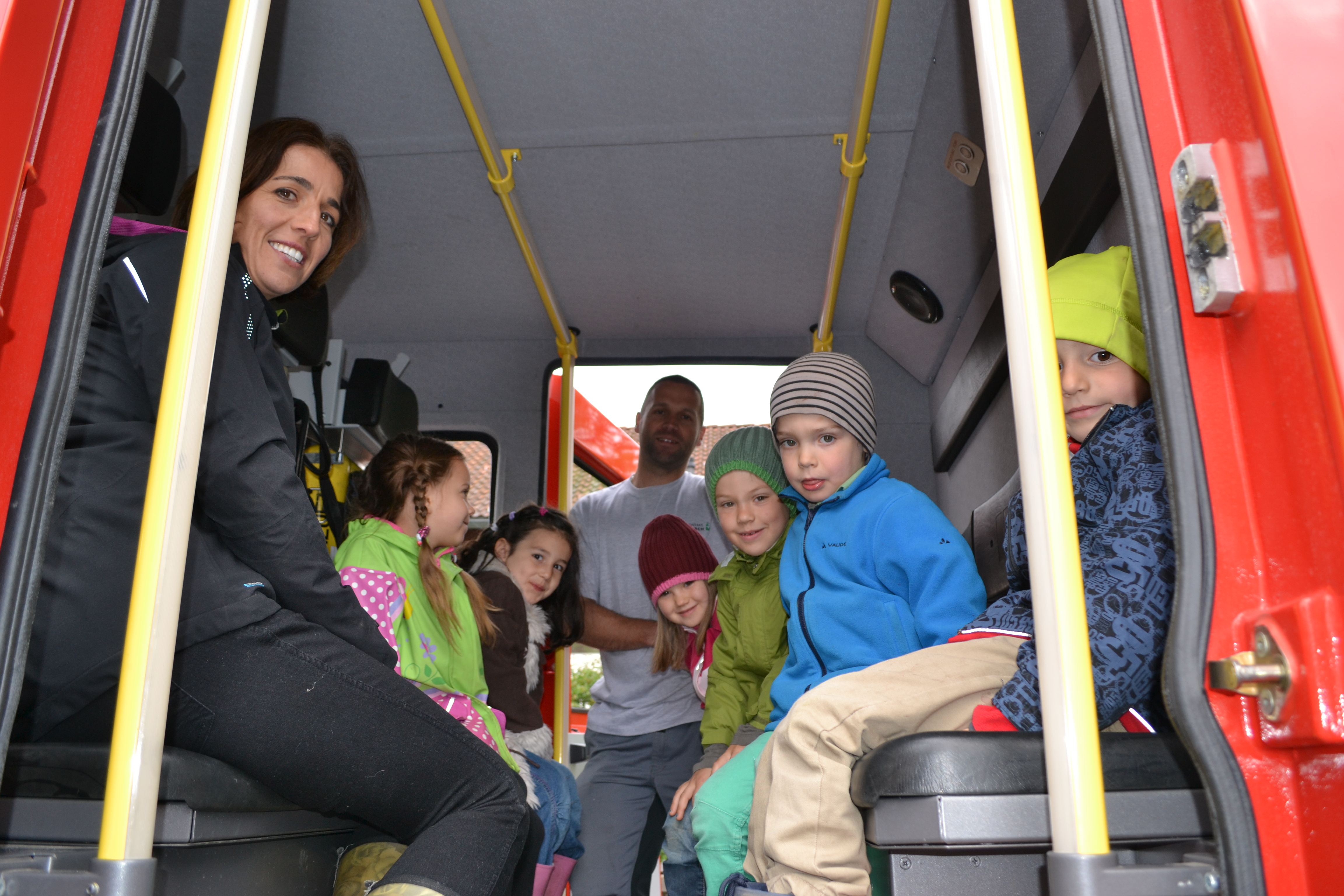 Amelie, Ecrin, Olivia, Vincenz, Quirin und Emil mit Pädagogin Karin Stocker und Feuerwehrmann Mario Walser im Tank-Löschfahrzeug