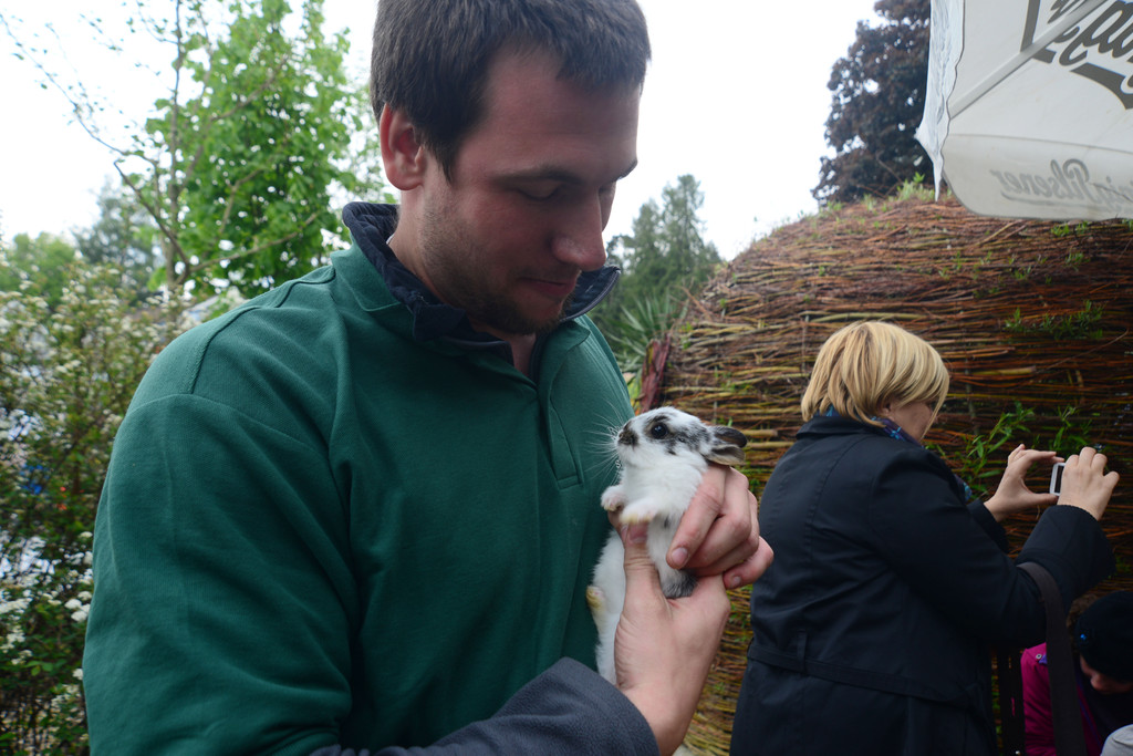 Stadtgärtnermeister Jürgen Kiesenebner mit einem der Zwerghasen.