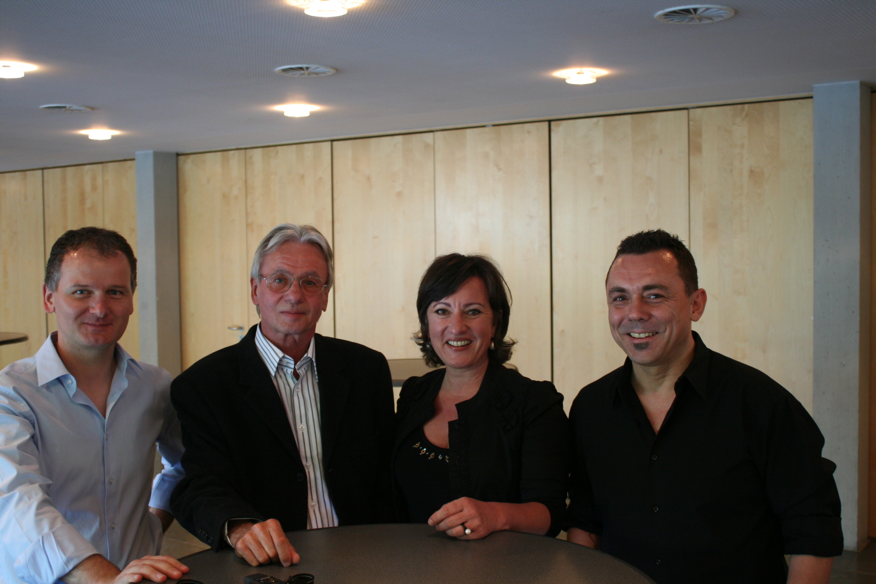 Saxophonlehrer Jürgen Müller, Hubert King, Musikschuldirektor André Moosbrugger mit Assistentin und Gattin Sabine