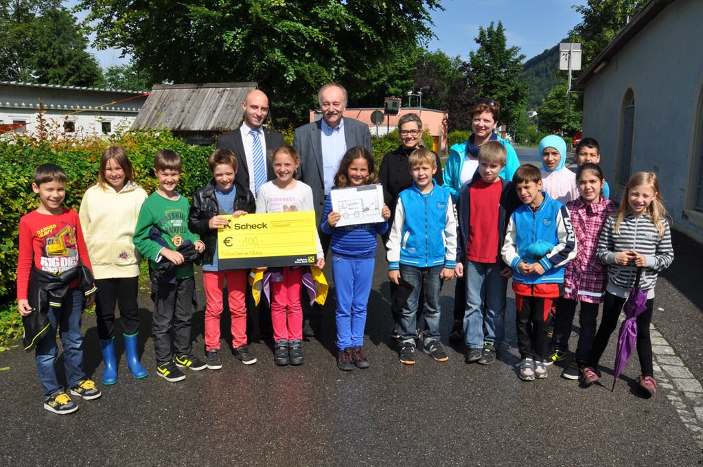 Die dritte Klasse der VS Kennelbach mit Direktorin, Bürgermeister, Desiree und Beat Schindler und Martin Schedler.
