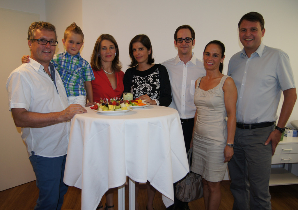 Bgm Kurt Fischer mit Beate, Dr. Martin Grabher mit Partnerin Marion Sohm (v. rechts). Dr. Günter Diem mit Sohn Paul und Partnerin Susanne Hagen (v. links).
