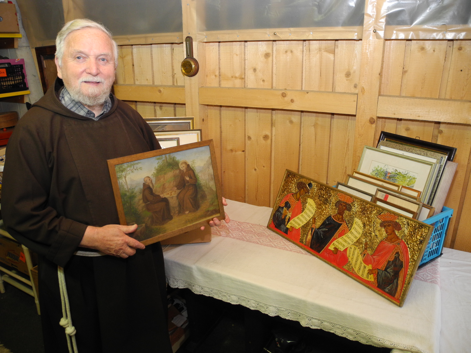 Bruder Gebhard zeigt die Schätze welche am Trödlermarkt angeboten werden