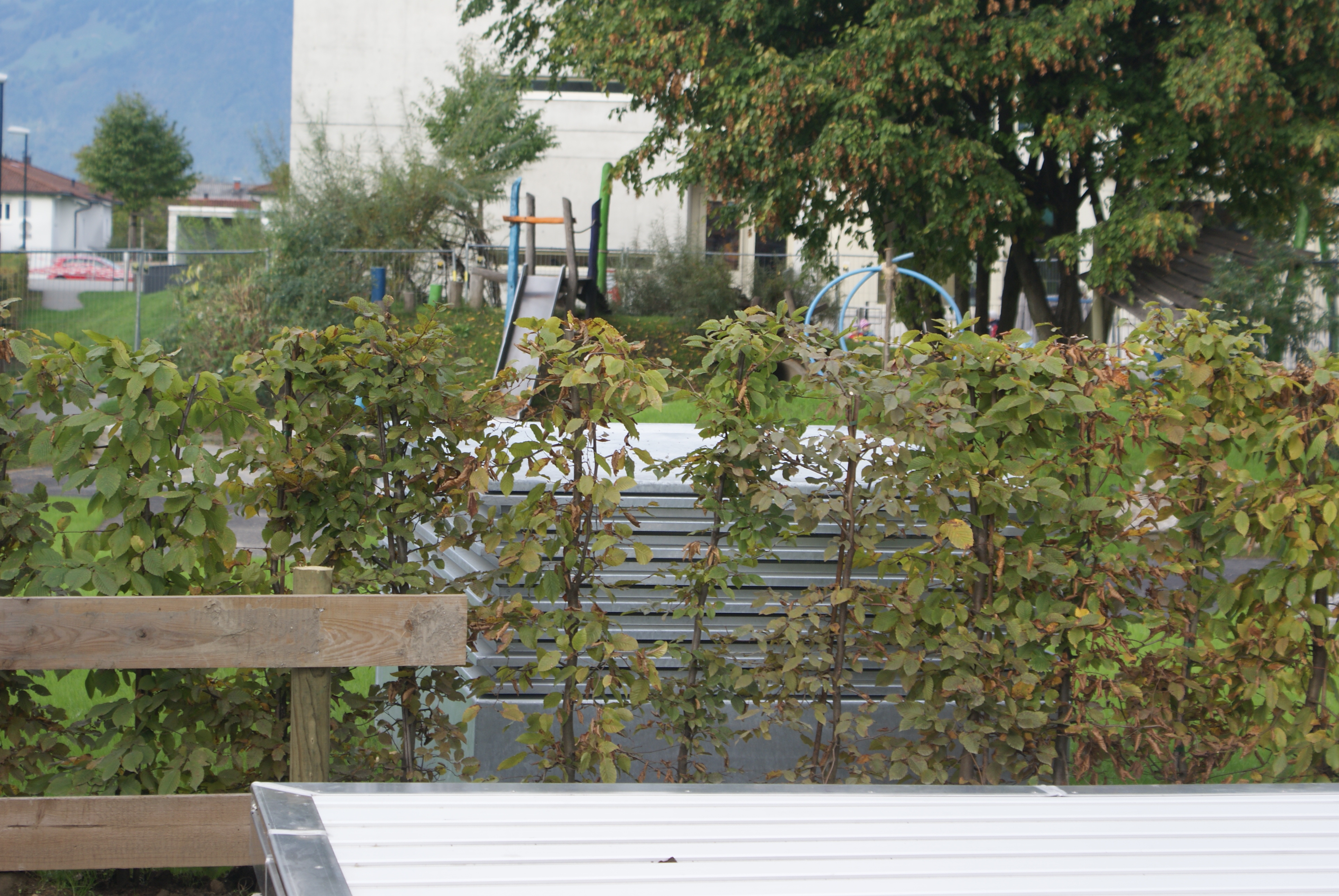 Der Kasten hinter der Hecke saugt die Luft für das Feuer an.