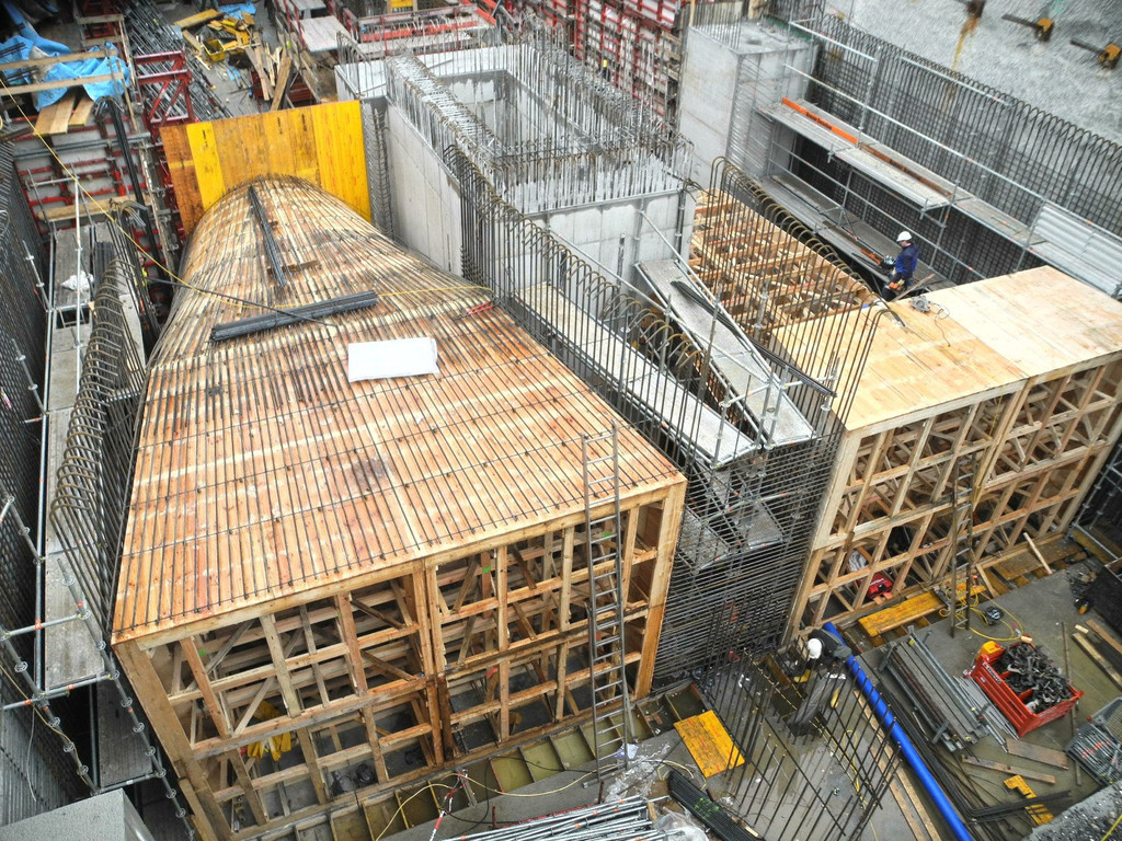 Gut erkennbar ist das Schalgerüst für des Turbineneinlaufbauwerk