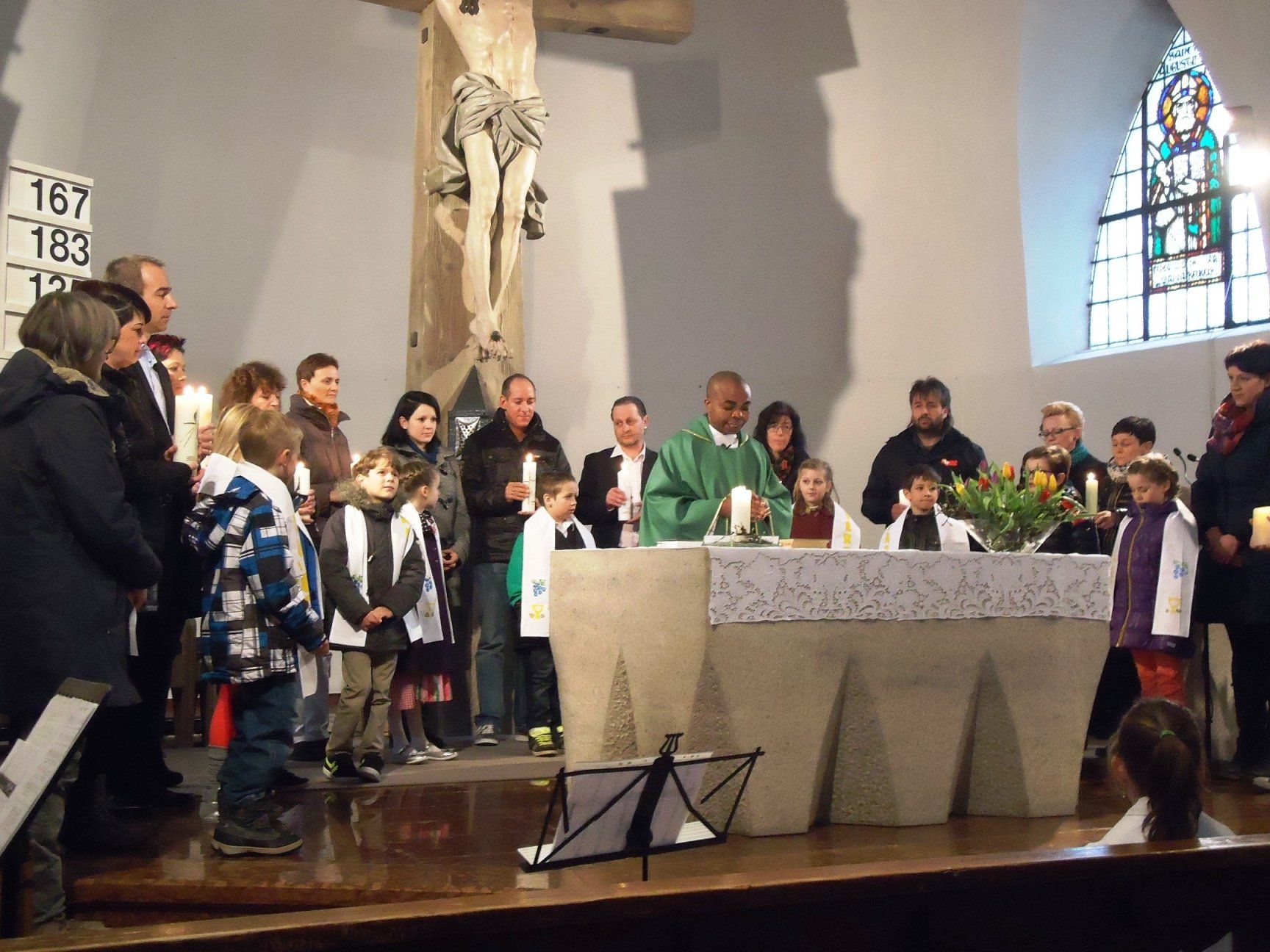 Pfarrer Plazide Ponzo stellte die heurigen Erskommunionkinder der Glaubensgemeinde vor.