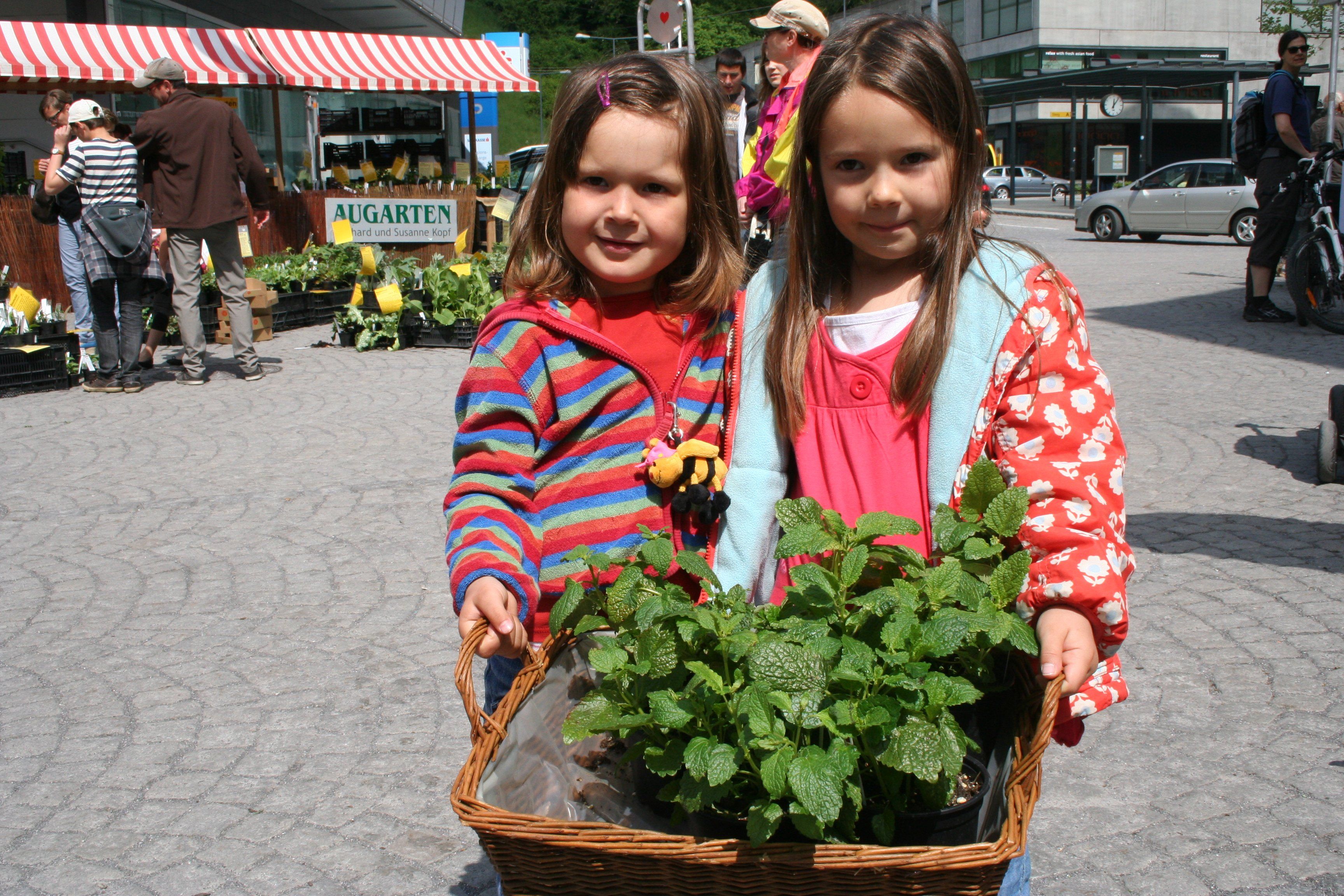 Leila und LIna freuen sich über ihre "neue" Zitronenmelisse.