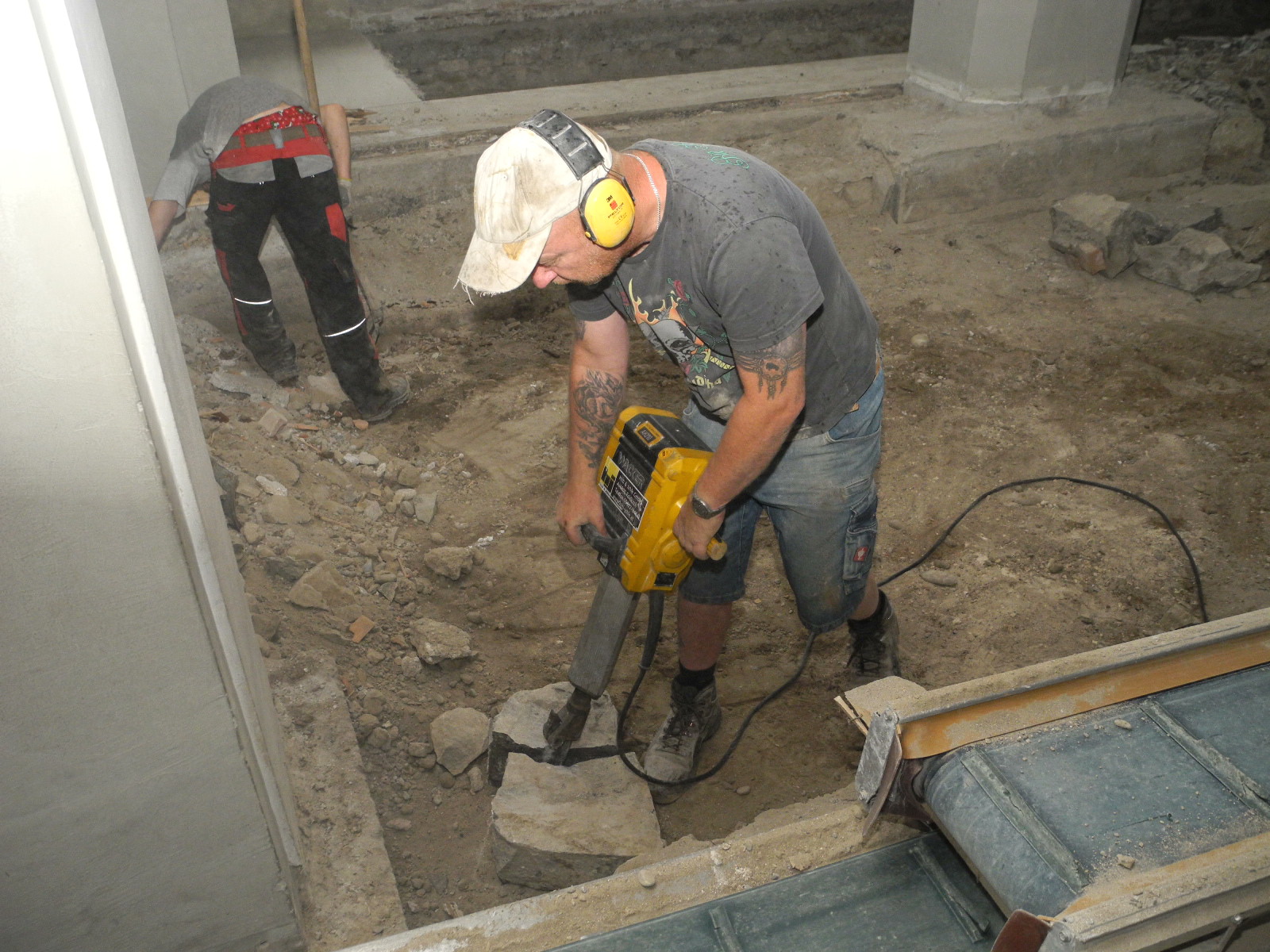 Harte Arbeit in der Kirche mit dem Pressluftbohrer