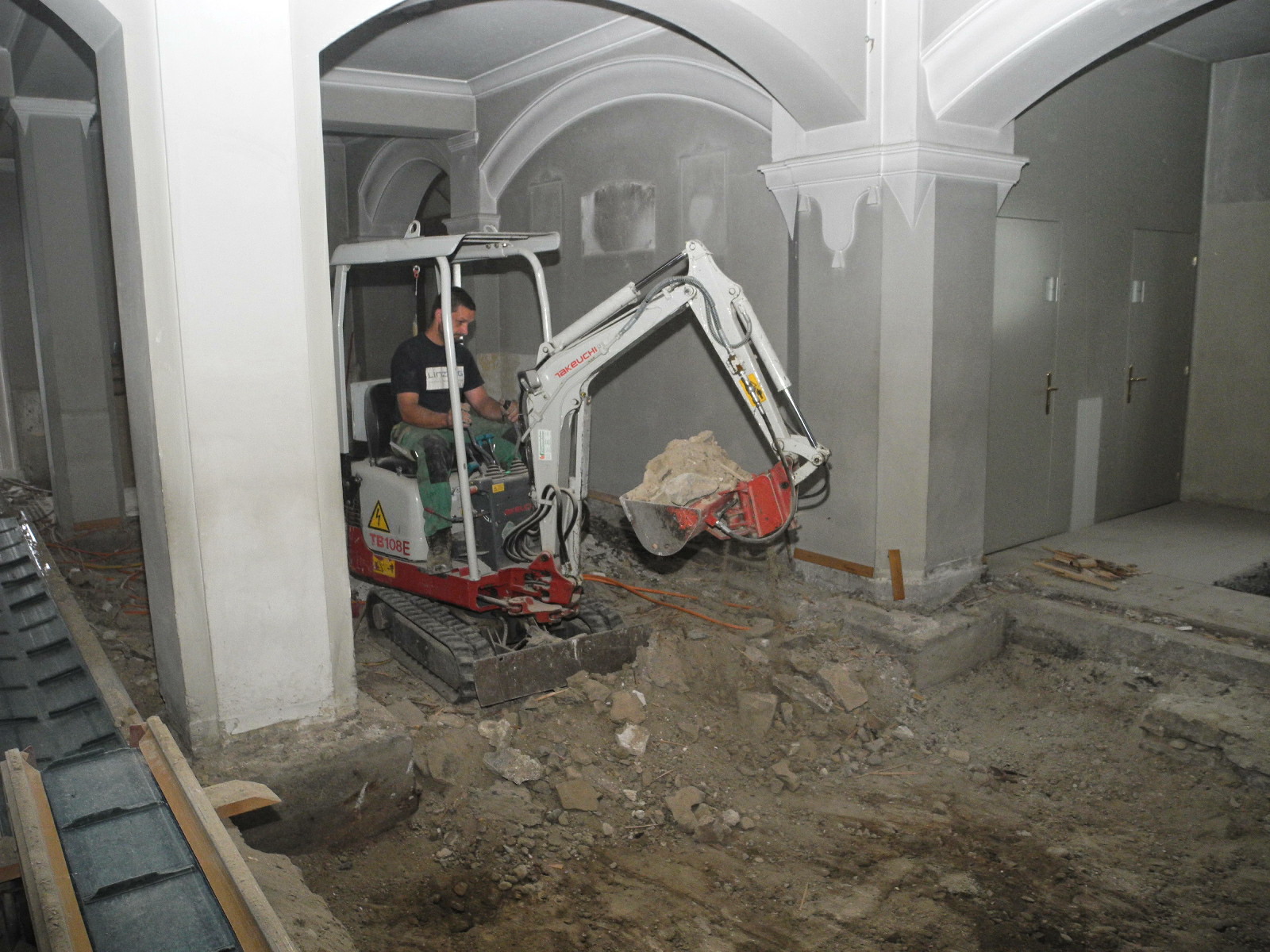 Bagger und Pressluftbohrer in der Kirche
