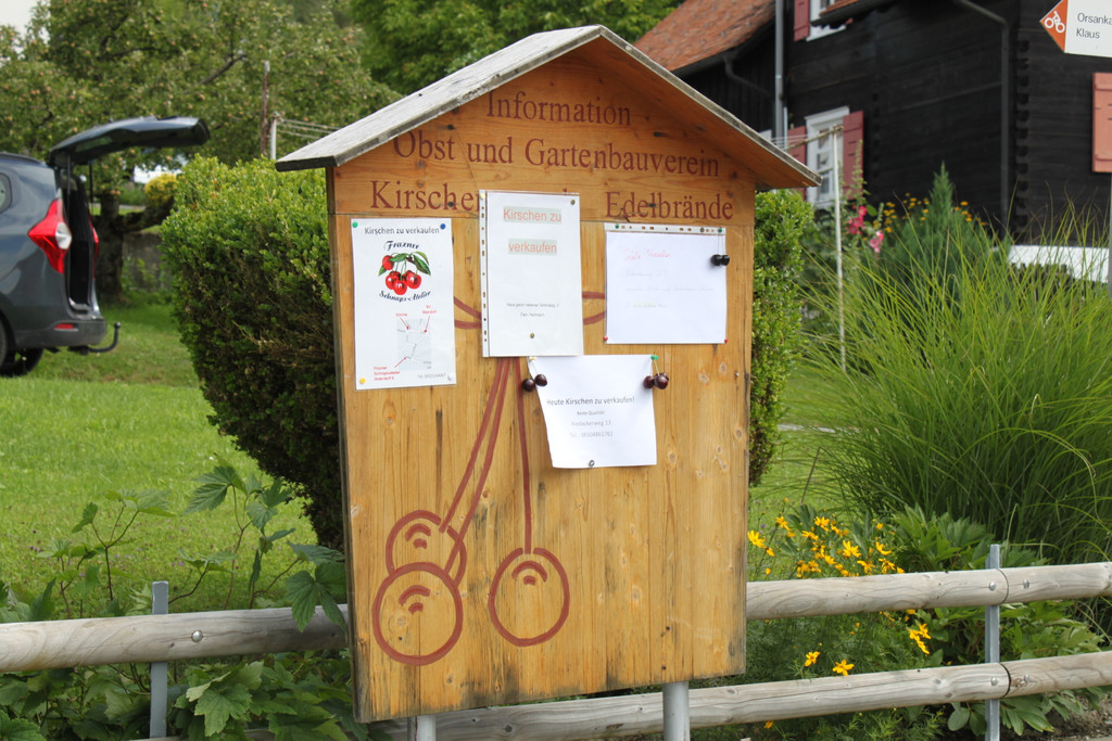 Kriasi-Tafel informiert am Ortseingang über die Kriasi-Verkaufsstellen im Dorf.