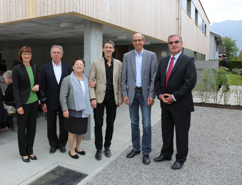 Ortsvorsteherin Doris Wolf , Günter, Juliane und Bauherr Johannes Lampert , Obmann Werner Gopp, Obmann Krankenpflegeverein Nofels, Peter Greussing, GF Rhomberg Bau
