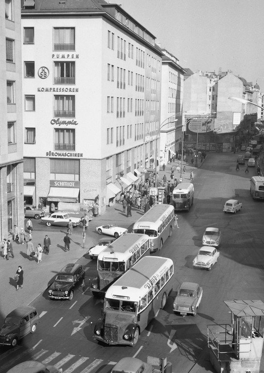 Busse der Linie 7, 8 und 9 am Stephansplatz im Oktober 1959