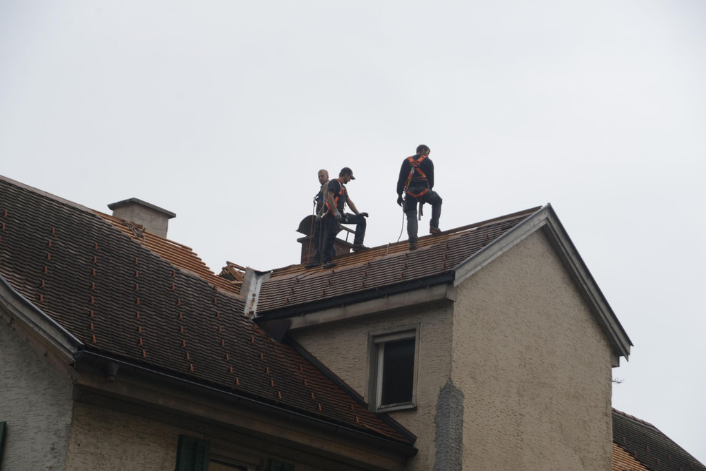 Bauarbeiter stiegen dem Haus aufs Dach, um den Abbruch vorzubereiten.
