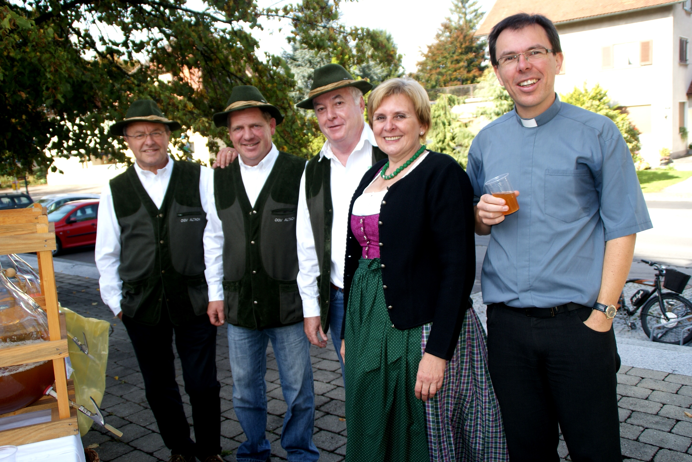 Erntedank mit dem OGV, auch Kaplan Rainer Büchel und Pfarrassistenin Ingrid Gerold genossen einen Schluck Most