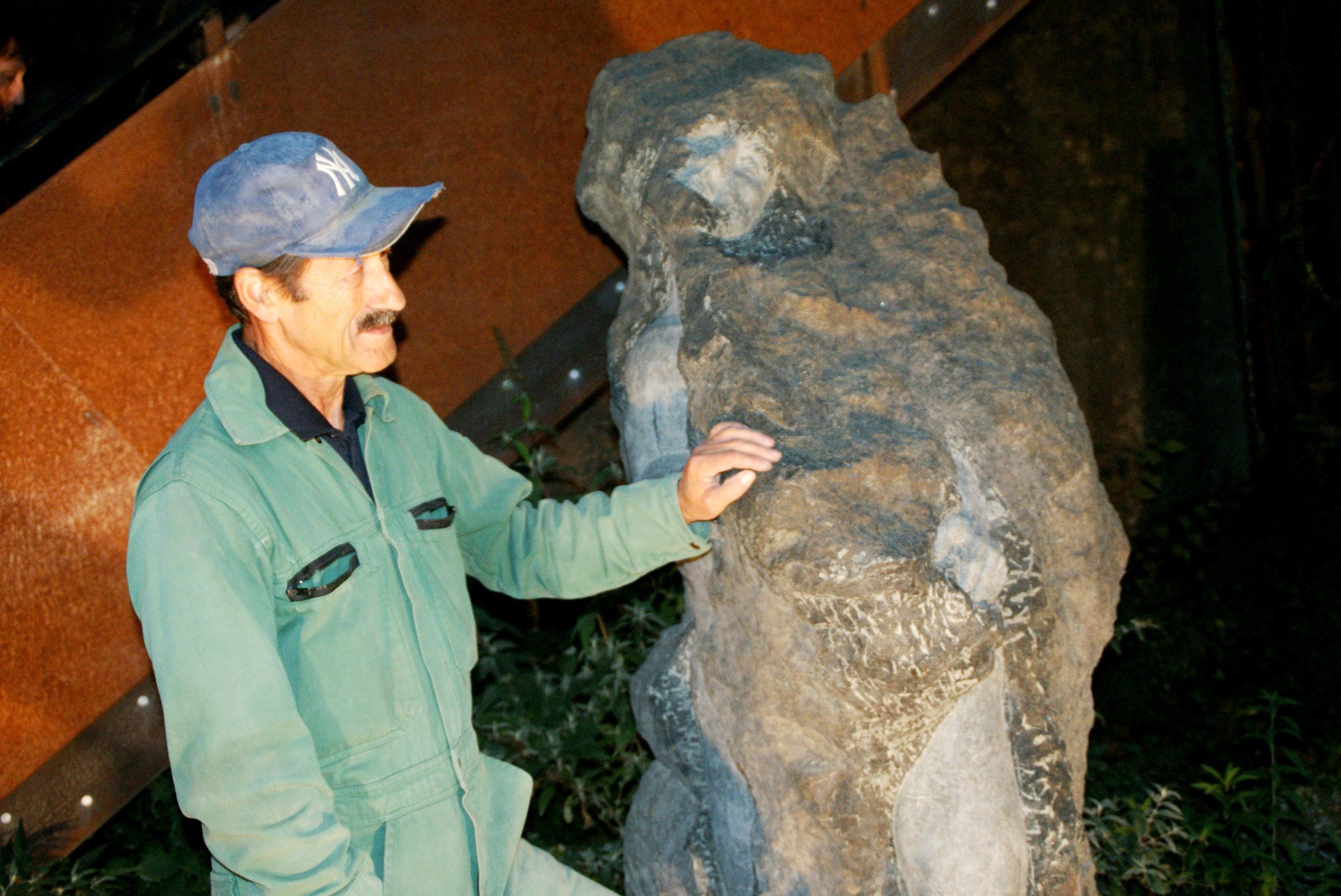 Der Künstler zeigt stolz seine Skulptur aus Lavastein