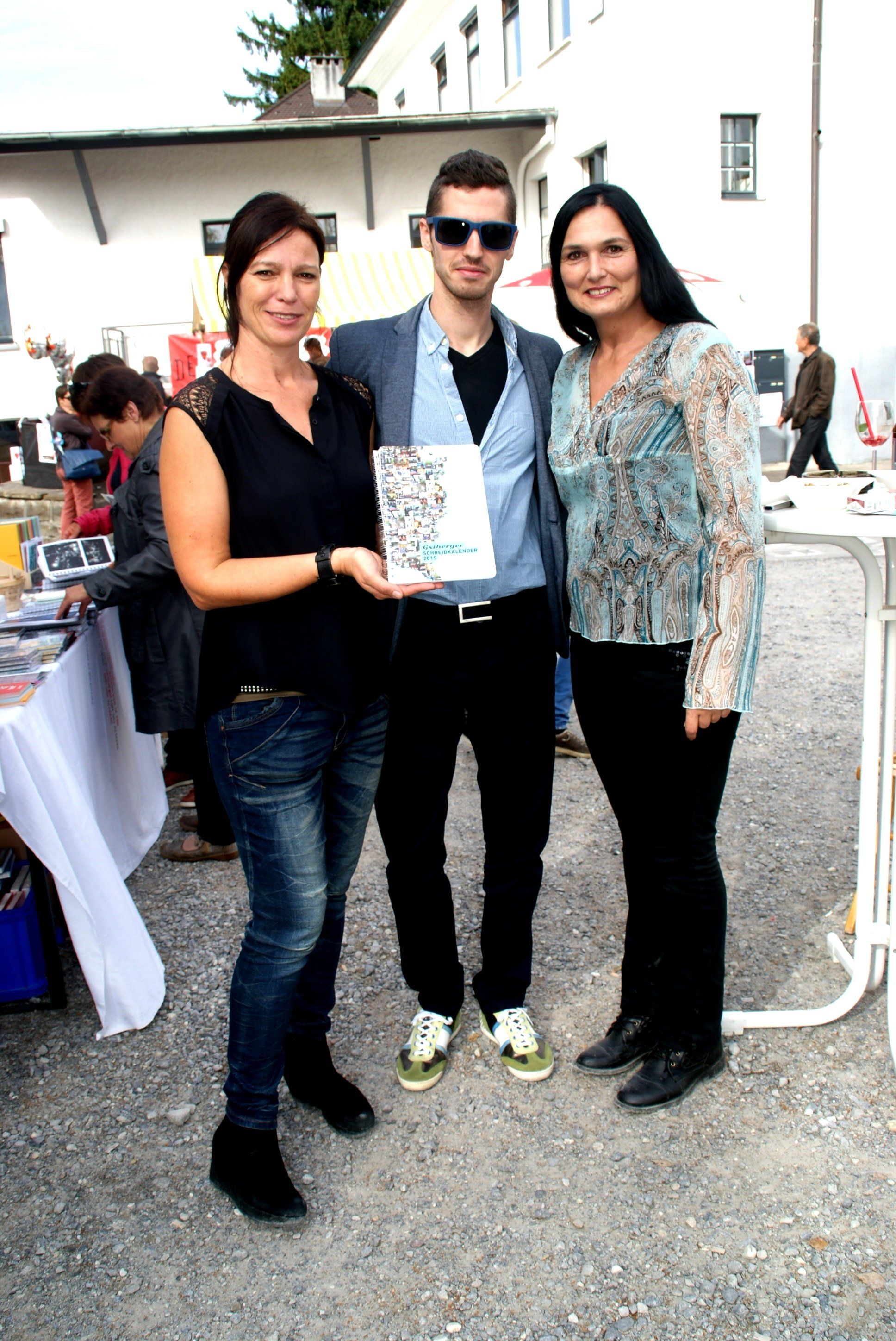 v.li. Sylvia Dhargyal (Grafikerin Schreibkalender), Drazen Gvozdenovic (russ. Akkordeonist), Rosie Mußner (Unart Produktion)