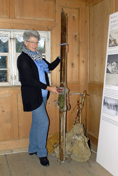 Marlies Kuster mit einem Paar Ski aus der Ausstellung "Silvretta Historica"