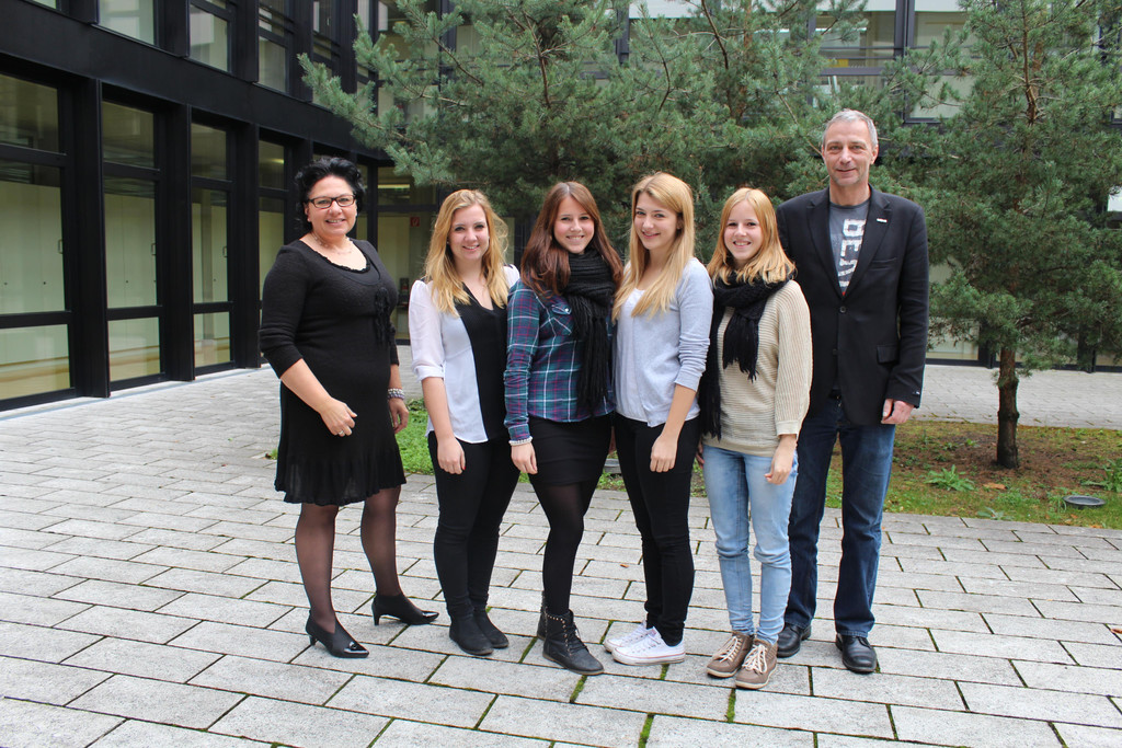 Corinna Erath, Sabrina Erath, Maria Huemer und Paula Plauschberger mit Projektbetreuerin Monika Drexel und Direktor Michael Weber.