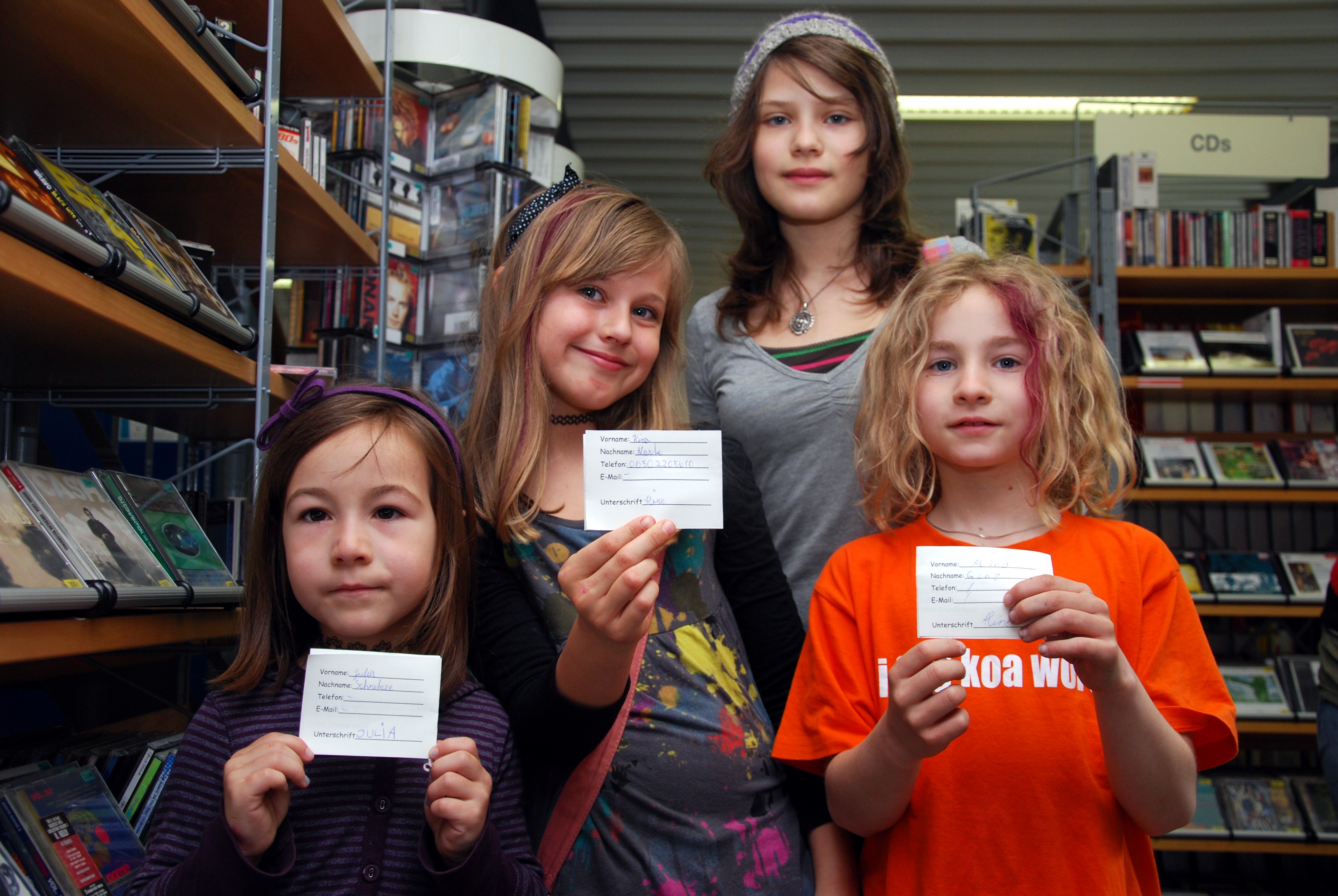 Julia, Kira, Joli und Alina mit ihren Kindercafé-Pässen. Damit konnten sie sich Essen und Getränke besorgen, darauf wurden aber auch gegebenenfalls die Mahnpunkte vermerkt.