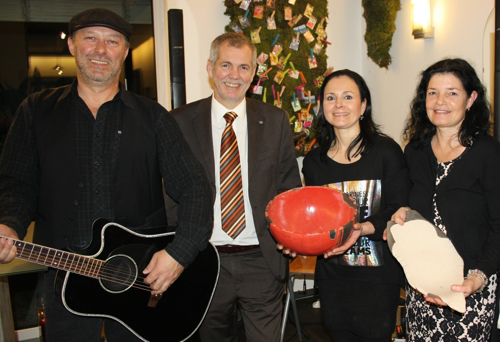 „Mooses“ alias Bruno Moosbrugger, Vorstandsmitglied Robert Sturn, Unternehmerbörse-Obfrau Veronika Matt und Künstlerin Andrea Wetzel.