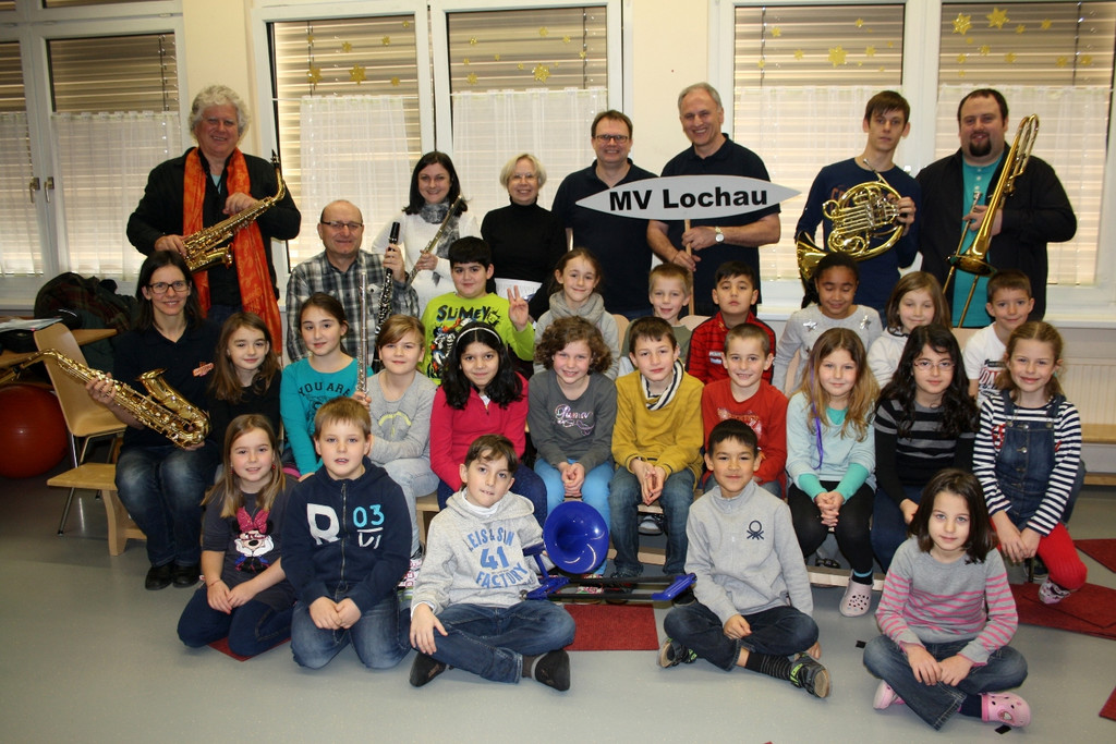 Lehrer der Musikschule Leiblachtal sowie Vorstand Wolfram Baldauf und die Jugendreferenten des Musikvereines Lochau begeisterten die Schüler für die Blasmusik.