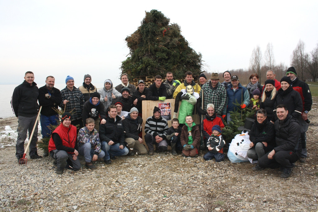 Das Team der Bäumler Faschings- und Funkenzunft vor ihrem Funken im traumhaften Ambiente direkt am Bodensee.