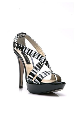 High Heel Riemchen Sandalette "RIVA": Schwarz-weiße High Heel Sandalette mit überkreuztem Lederriemen in Flechtoptik (