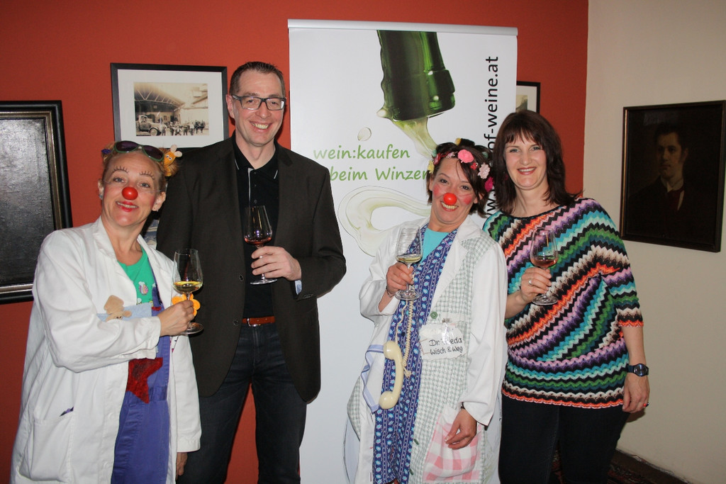 Die CliniClowns Dr. Frieda Wisch & Weg und Prof. Dr. Paula Plüsch mit Herbert Bischof und Andrea Sinz (Vinothek wein:gut Bischof in Klaus).