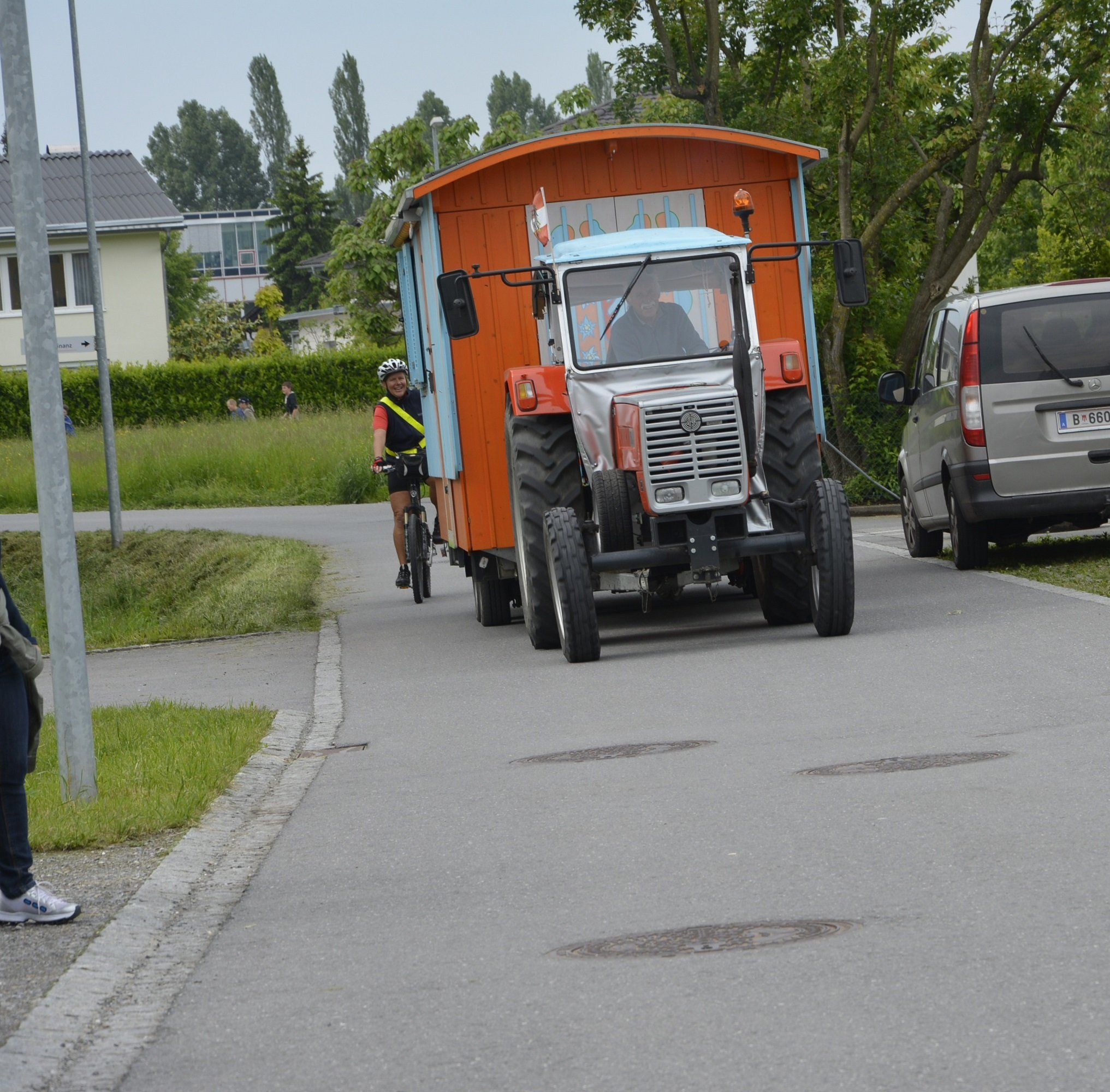 Der Traktor samt Schäferwagen rollt das letzte Stück auf der Bildgasse nach Hause.