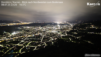Blick vom Dornbirner Hausberg Karren auf das untere Rheintal zum Bodensee. Webcam auf rund 880 Meter. (karren.at)