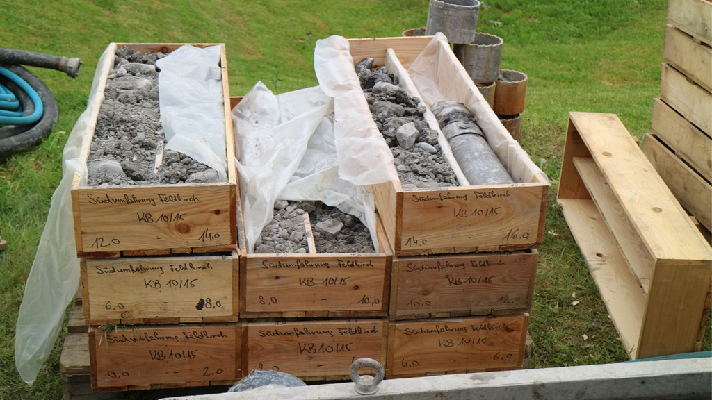 Die Bohrkerne und weiteres loses Material aus den verschieden Schichten, meist Kalkstein und Mergel, wird dann in Kisten verpackt, beschriftet und von der Firma 3G Gruppe Geotechnik aus Graz geologisch untersucht.