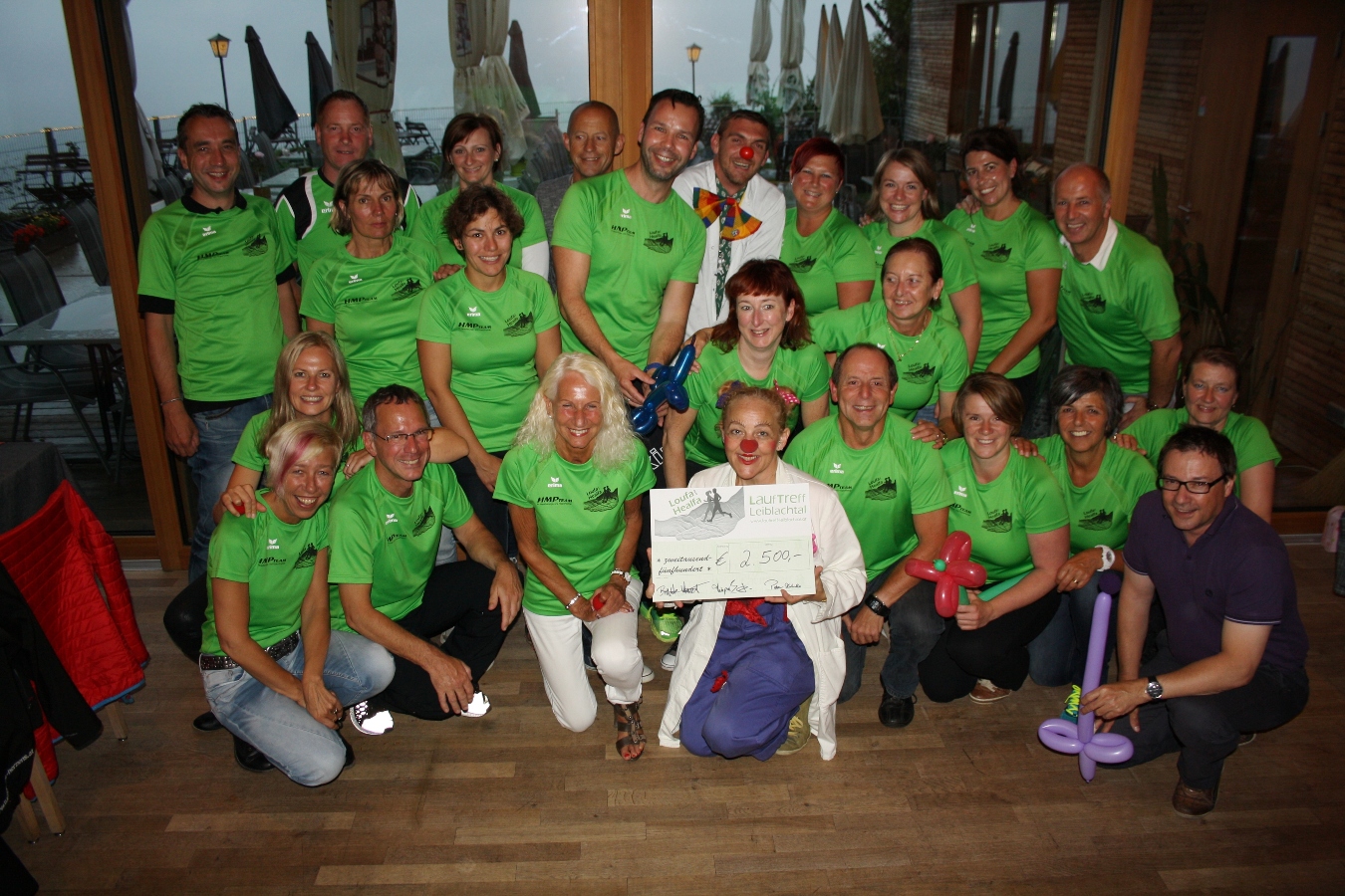 Scheckübergabe an die CliniClowns Vorarlberg mit Prof. Dr. Paula Plüsch und Dr. Stift beim LaufTreff-Leiblachtal-Helferfestle im „Gasthaus Seibl“ am Oberhaggen.