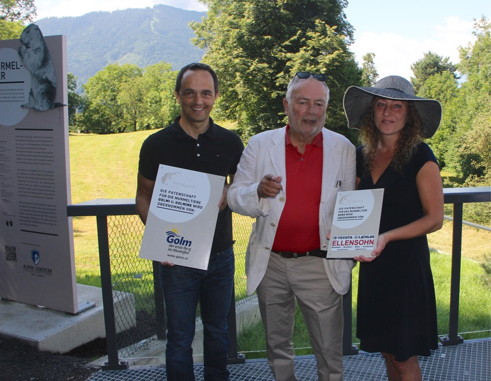 Tierpate Hannes Jochum von den Golmer Bahnen und Layla Ellensohn von Toyota Ellensohn mit Wildparkpräsident Wolfgang Burtscher.