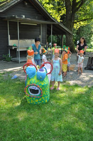 Die Kinder des KG Oberau mit dem "Müllfresser"