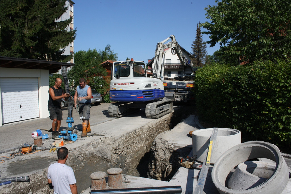 Der Einbau der Wasserleitung samt den notwendigen Wasserschiebern wird von den „Wasserbaumeistern“ Andreas Fessler und Roland Felder vom Lochauer Wirtschaftshof durchgeführt.