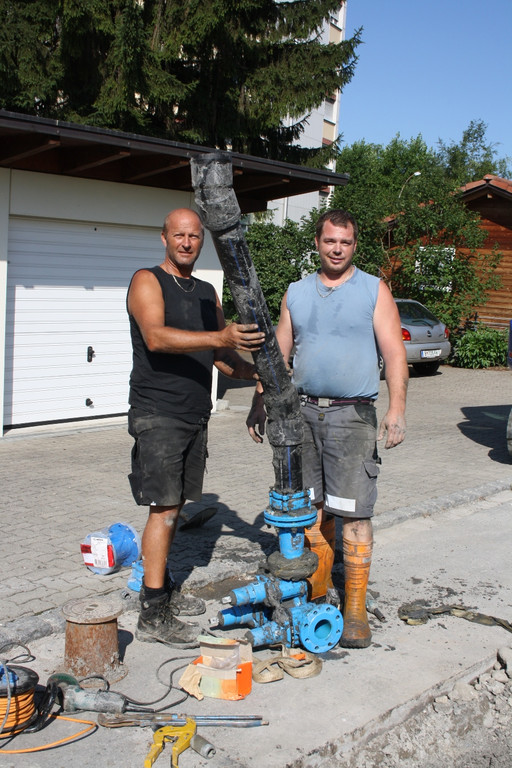 Der Einbau der Wasserleitung samt den notwendigen Wasserschiebern wird von den „Wasserbaumeistern“ Andreas Fessler und Roland Felder vom Lochauer Wirtschaftshof durchgeführt.
