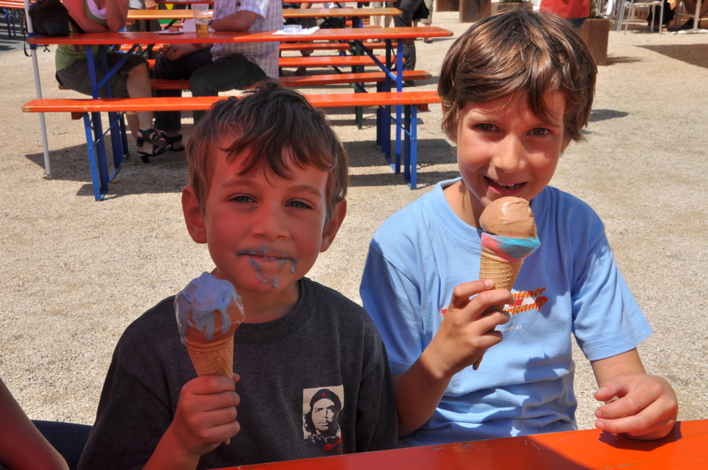 Pius und Emilia geniessen ein Eis.