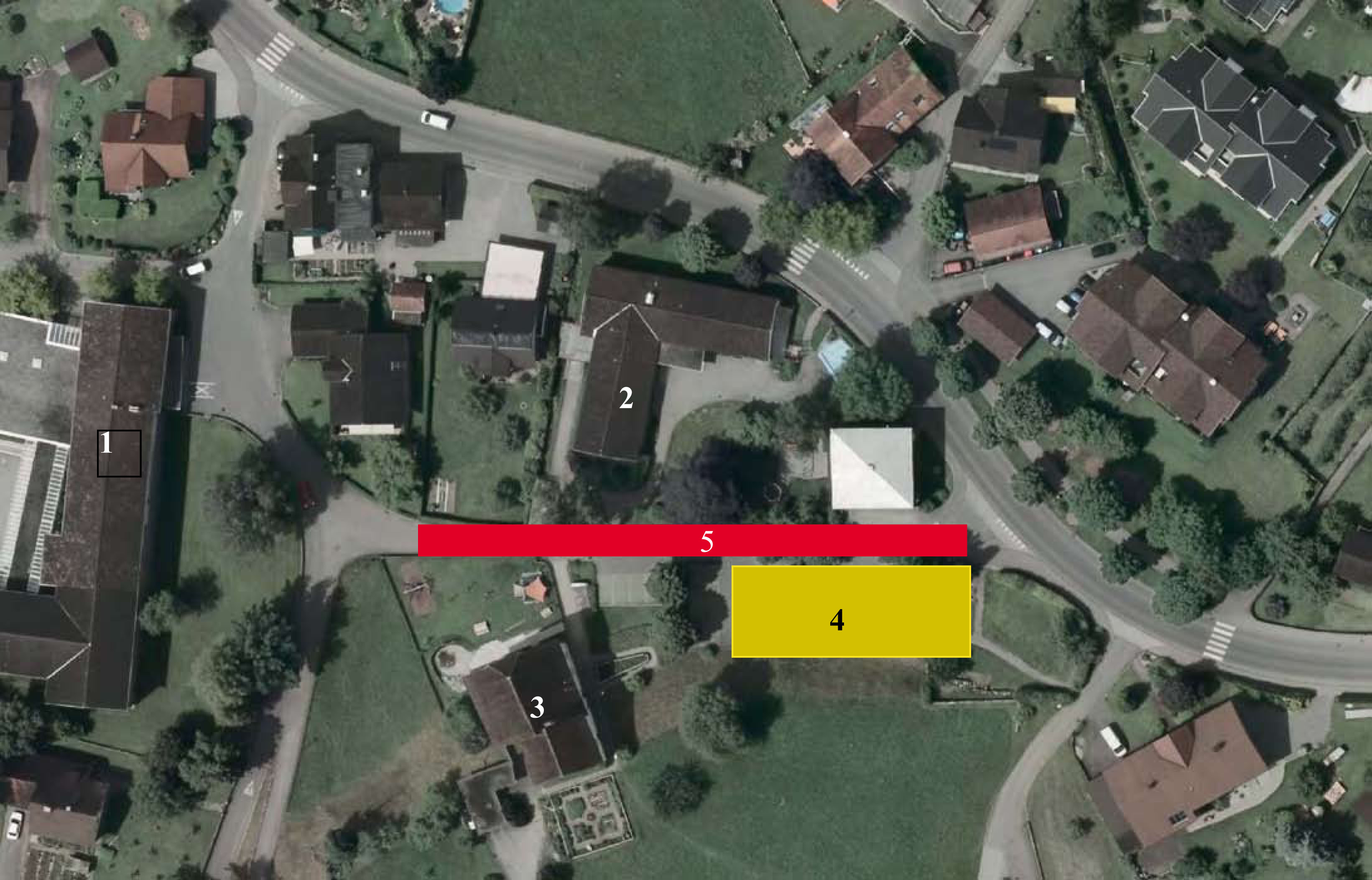 Bestand: 1= Volksschule, 2= Kindergarten, 3= Pfarrhaus; geplant 4-Neubau Kinderbetreuung, 5- Teilauflösung der Sigmund Nachbaur Str.