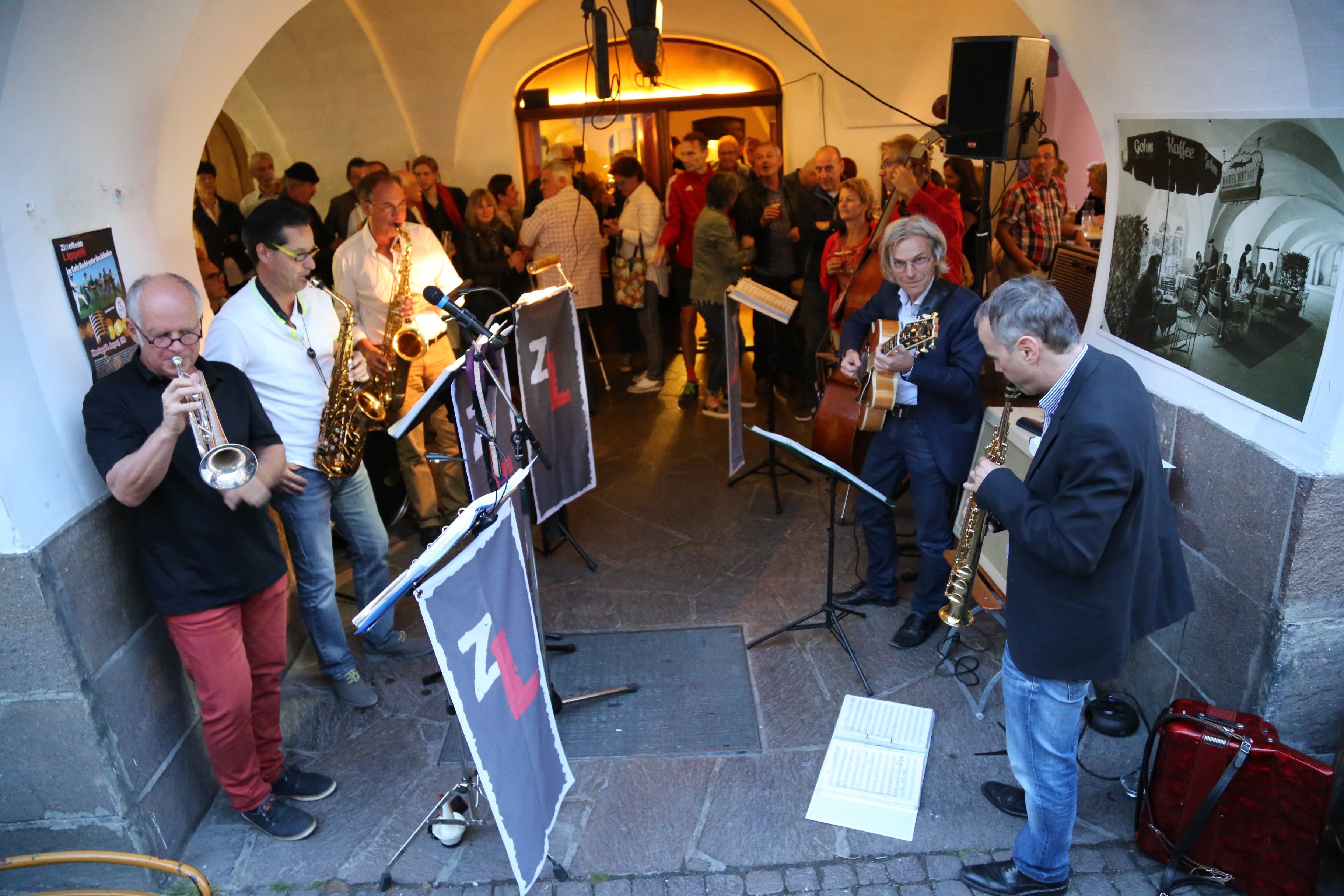 „Die Zitternden Lippen“ vor dem Café Hecht