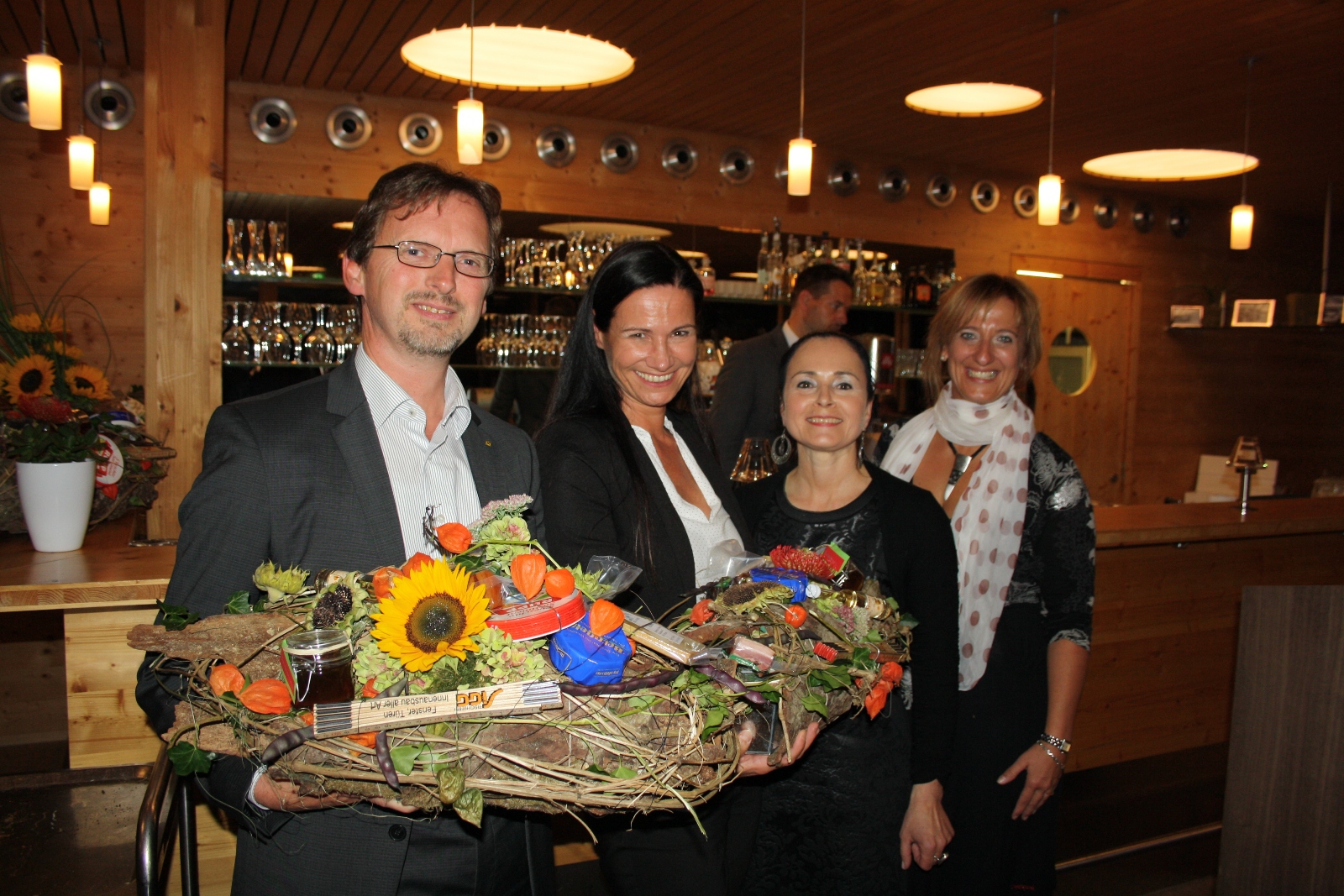 „Leiblachtaler Geschenksbouquet“ für Hubert Gieselbrecht (Raiffeisenbank) und Barbara Stanzel (Sparkasse), im Bild mit Veronika Matt und Bianca Igl.