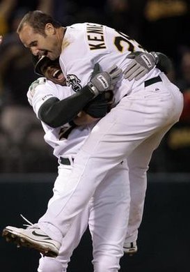 APTOPIX Rangers Athletics Baseball: Adam Kennedy, Rajai Davis (AP)