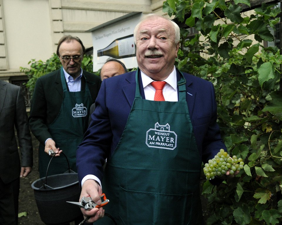 Häupl bei verregneter Weinlese in Wiens kleinstem Weingarten
