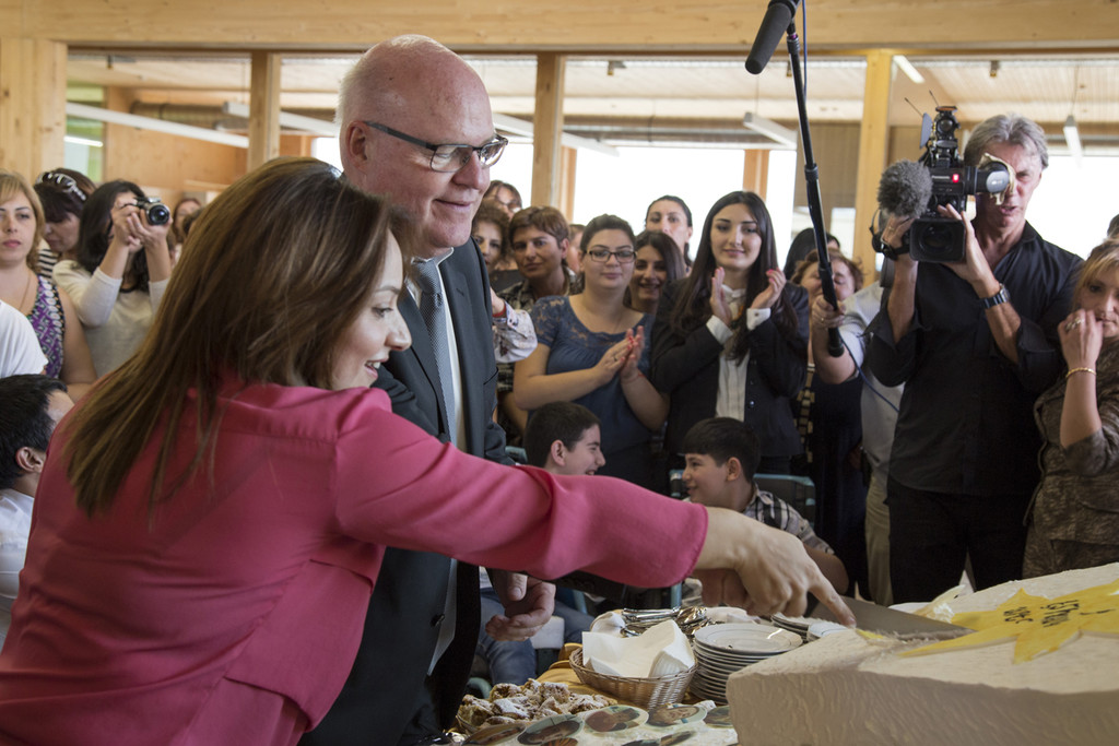 Tigranuhi Akopyan, Direktorin Emils Kleine Sonne und Caritasdirektor Peter Klinger hatten die ehrenvolle Aufgabe des Tortenanschnitts.