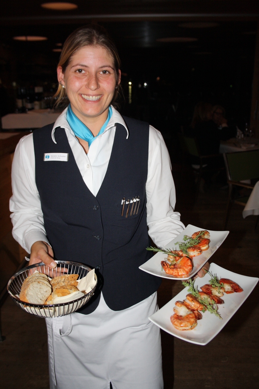 Riesengarnelen in Knoblauch-Kräuter-Butter und Baguette – serviert vom Seehotel-Service-Team.