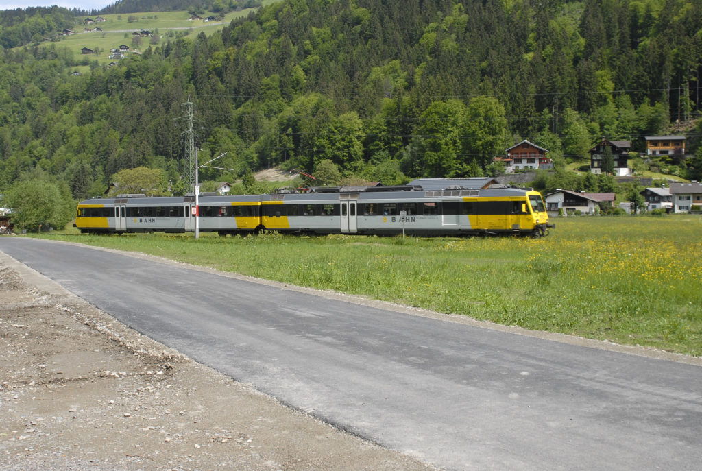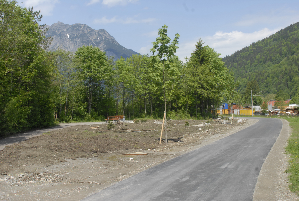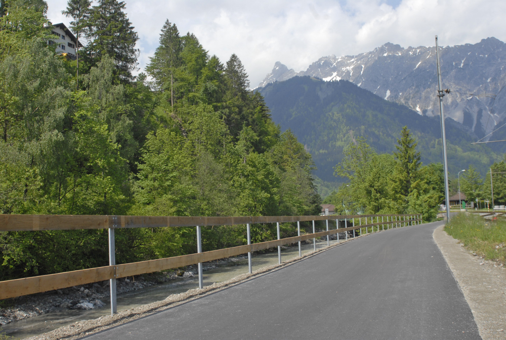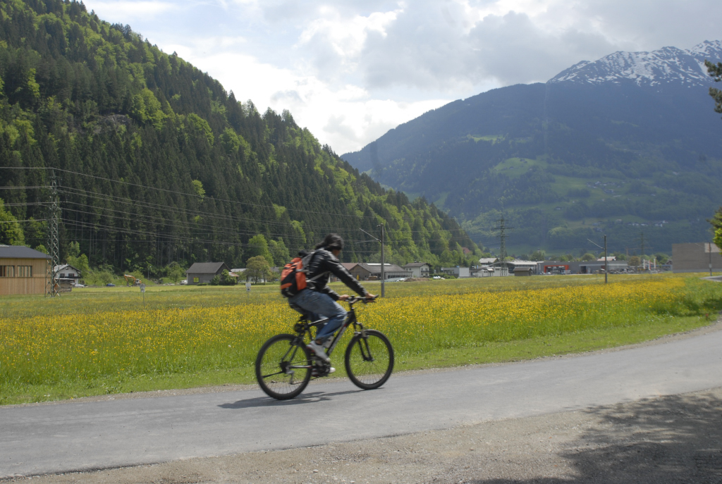 Der alte und neue Radweg Schruns - Gantschier, Radfahrer, die Montafonerbahn und eine Eidechse.