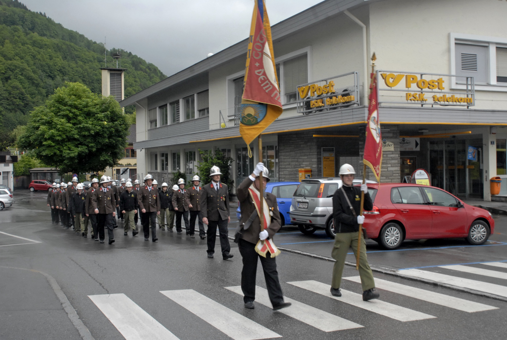 Die Harmoniemusik Schruns und Ortsfeuerwehr Schruns auf dem Weg zur örtlichen Kirche. Ministranten ziehen in die Kirche ein.
