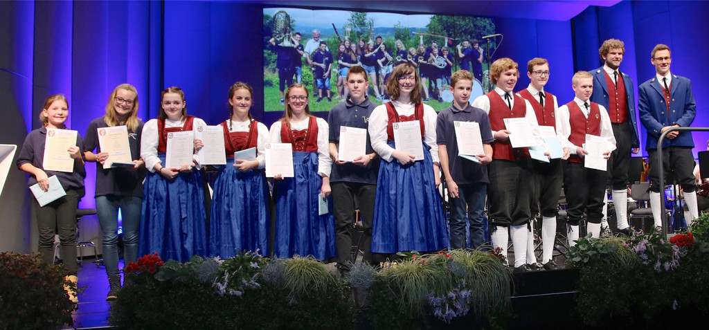Auszeichnung der erfolgreichen Jugendmusikanten: Lea Kornexl, Hannah Kraßnitzer, Janine Mähr, Anna Stieger, Sophie Hallmann, Lucas Köchle, Isabell Schelling, Klaus Plank, Oliver Biederman und Franz Plank