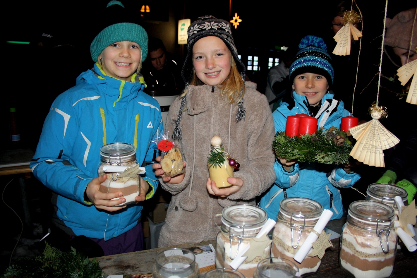 Vielseitige Auswahl an Selbstgebasteltem und Selbstgemachtem am Stand der Volksschulkinder.