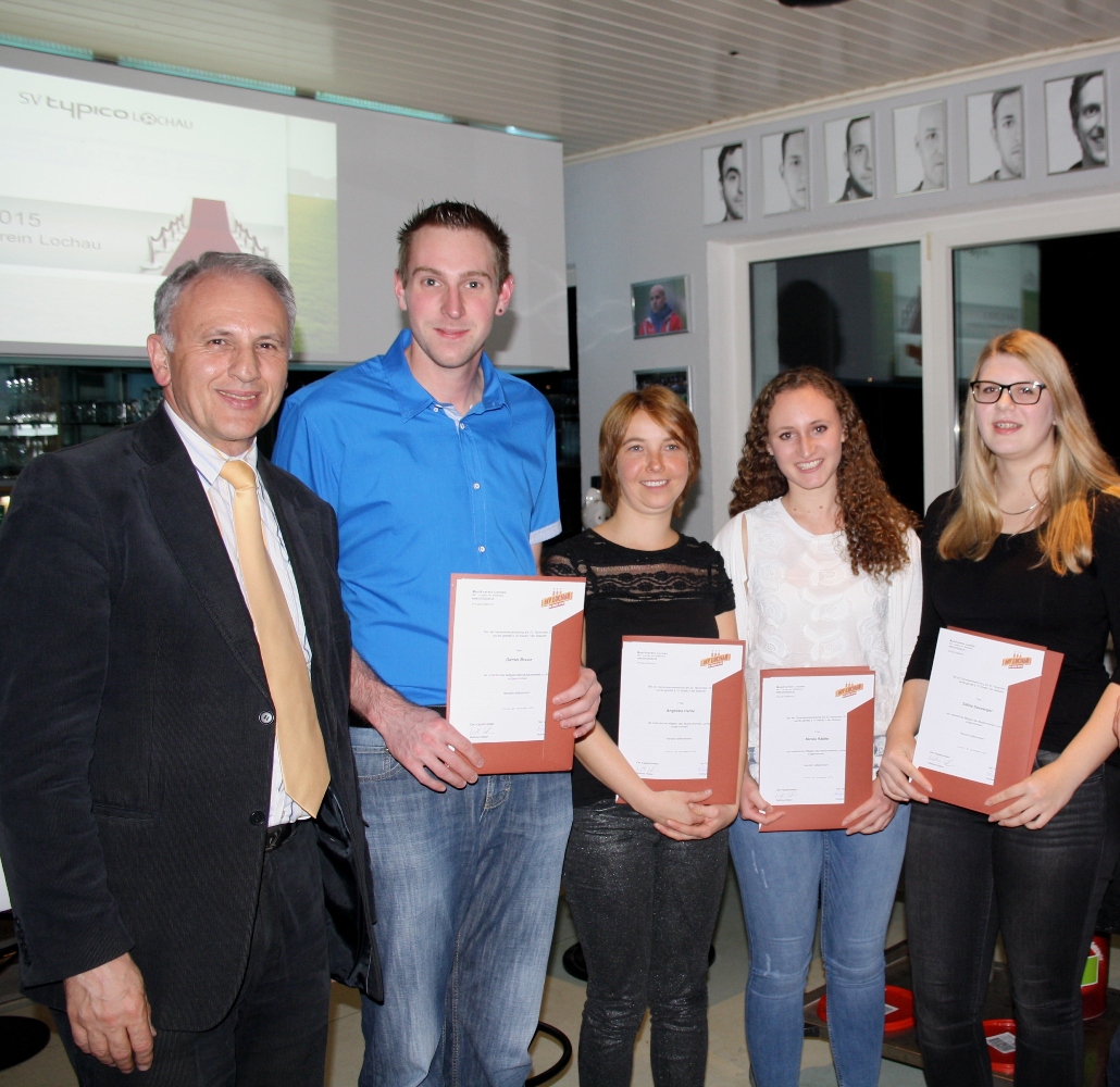 Neu in den Musikverein aufgenommen wurden Daniel Braun (Klarinette), Angelika Hehle (Klarinette), Nicola Rädler (Querflöte) und Selina Sausenger (Klarinette), im Bild von links mit Vorstand Wolfram Baldauf.